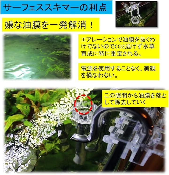 「サーフェススキマーの利点」:嫌な油膜を一発解消できる。エアレーションで油膜を抜くわけでないのでCO2逃げず水草育成に特に重宝される。
