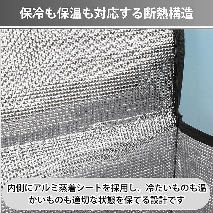 「保冷も保温も対応する断熱構造」内側にアルミ蒸着シートを採用し、冷たいものも温かいものも適切な状態を保てる設計です。