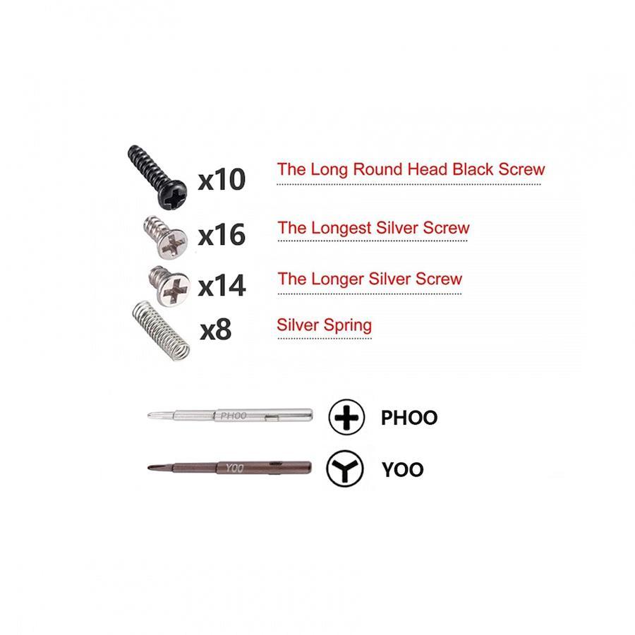 パッケージにはJoyconの交換用ケース (電子部品は含まれていません)、フルセットボタン、クロス、Y00ドライバーセット、スペアネジが含まれます。