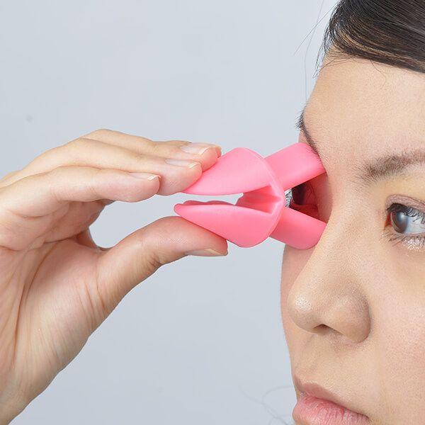 (1)目を開いた状態で製品の羽根部分を持ち、羽の付け根側を目頭に合わせ、まぶたに軽く押し当てる。