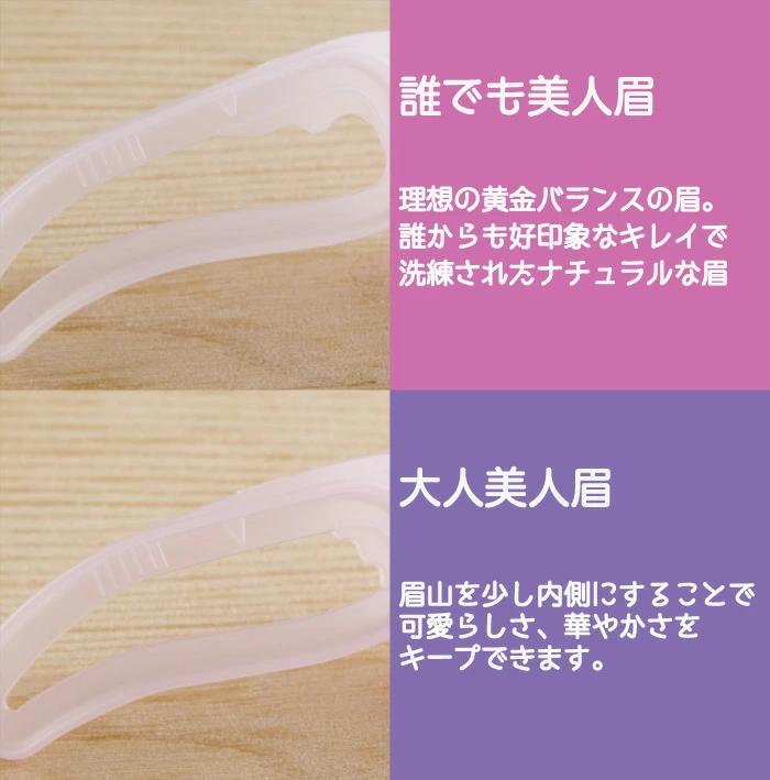取扱上の注意・乳幼児の手のとどかない安全な場所に保管してください。・周囲の環境に気を付け、目、肌等を傷つけないよう、鏡を見ながらご使用ください。・汚れが付着した場合はぬるま湯で洗い、よくすすいだ後、水気をふき取って下さい。・熱したり、無理に曲げたりしないでください。破損の原因となります。・眉を描いたり整えたりする道具です。その目的以外に使用しないでください。・眉間には個人差があります。自眉に合わない場合、縦横にずらして左右片方ずつ・合わせてご使用頂くと自然な形に仕上がります・仕上がりには個人差がございます。・表のイラストはイメージです。
