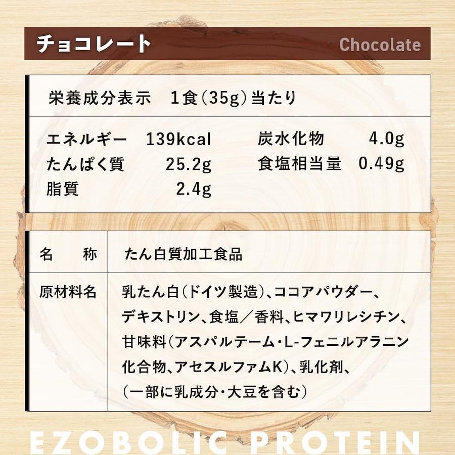 【プロテイン専門店がこだわり抜いたプロテイン】エゾボリックは2017年に札幌市で開業した北海道発のプロテイン専門店。お客様に美味しく飲んでいただくため、フレーバーメーカー複数社へ細かなリクエストを行い、送られてくるサンプルから厳選し、更に自社独自で改良を加え味を完成させています。北海道の美味しい素材を生かした、プロテインをぜひ味わってください。 【1食あたり25.2gのたんぱく質含有】品質にこだわり、1食あたりのたんぱく質は25.2g!効率良くタンパク質を摂取したいトレーニーから少量でも高タンパク質のプロテインを摂りたい普段使いの方にもおすすめです。 【おいしさへのこだわり】①美味しさ:原価を気にせず厳選素材を贅沢に使用。②溶けやすさ:独自の配合で溶けやすさを実現、水でも泡立ちや粉っぽさを抑えたなめらかな舌触りです。③配合:フレーバーによってそれぞれの味が引き立つ独自配合。 【チョコレート】チョコ感はしっかりありながらも甘すぎない。定番ながら味は抜群と定評があります。 【おススメのお召し上がり方】朝食時やトレーニング前後の摂取がおススメです。1日当たり1?3回を目安にお召し上がりください。シェーカーやミキサーなどに水150~200㏄と本製品を付属スプーンですり切り3杯程度(約35g)を入れてください。15秒ほどシェイクして、お召し上がりください。