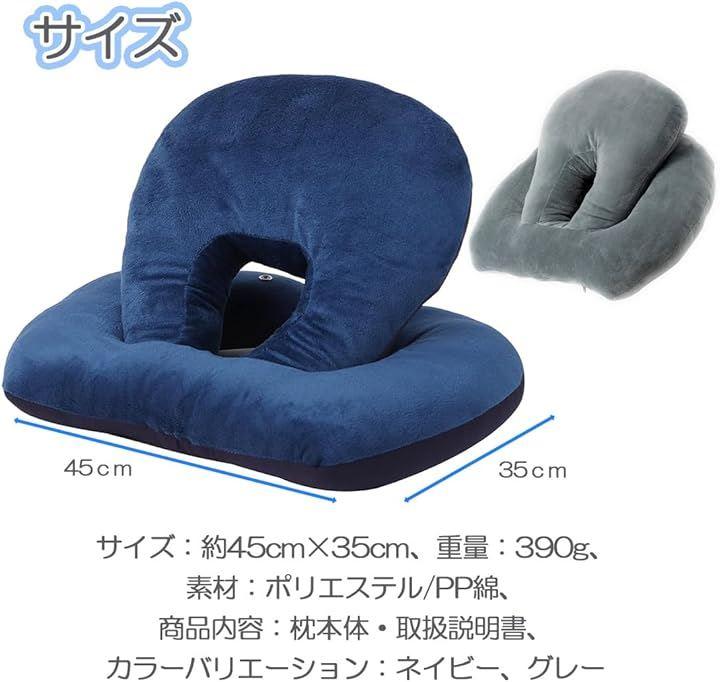 「商品詳細」サイズ:45cmx35cm、重量:390g、素材:ポリエステル/PP綿、商品内容:枕本体・取扱説明書、カラーバリエーション:ネイビー、グレー