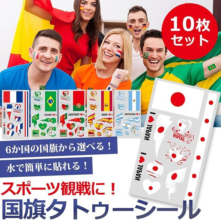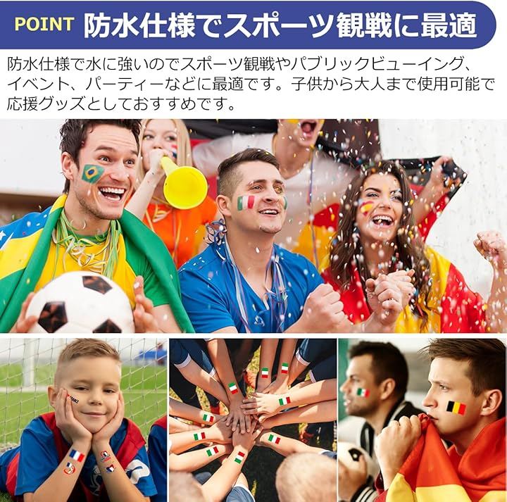スポーツ観戦、イベント、パーティー、応援グッズとして繰り返し購入される人気の国旗タトゥーステッカーです。