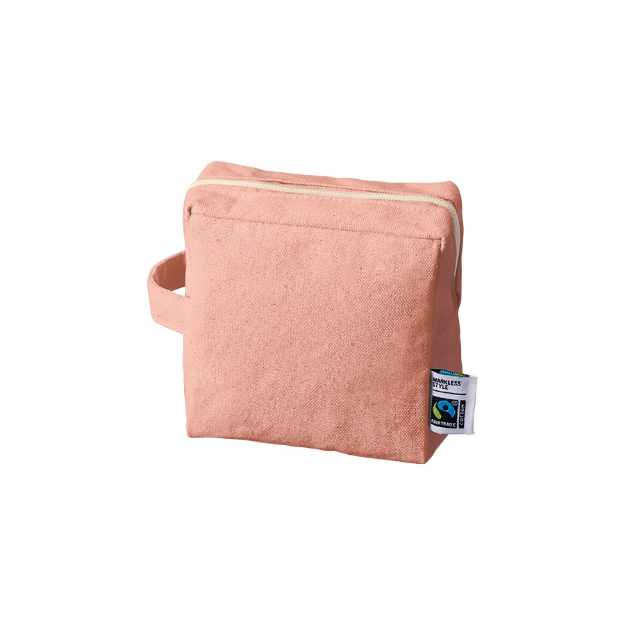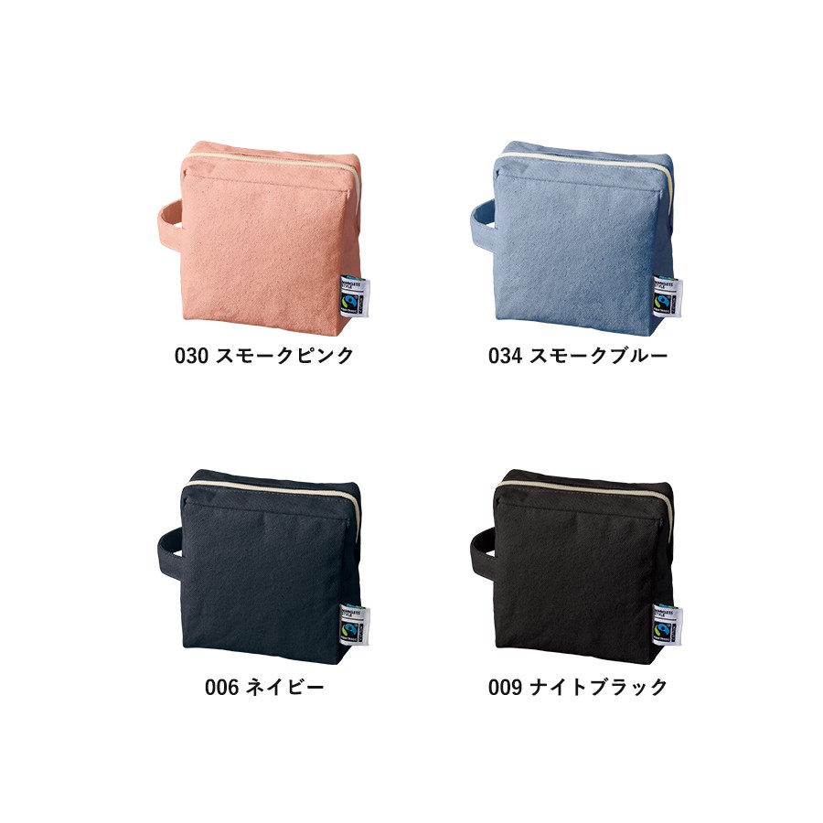 フェアトレードコットンを使用したキャンバスポーチです。スクエアタイプのポーチで、アクセントとしてハンドルが付いているのが特徴です。Sサイズは正方形型で、リップやイヤホン等の小物を入れることができ、普段使いにもオススメのサイズ感です。サイズはS・M・Lサイズの3サイズ展開しており、ご利用用途によって使い分けがしやすい商品です。国際フェアトレード認証ラベル付きのアイテムとなっており、SDGsやサスティナブルへの取り組みで企業価値を高められます。染色工場もフェアトレード認定工場で生産されており、染料は第三者認証を受けた製造工場で生産しているものを使用しております。