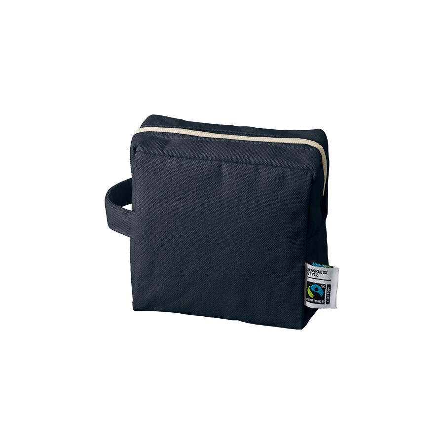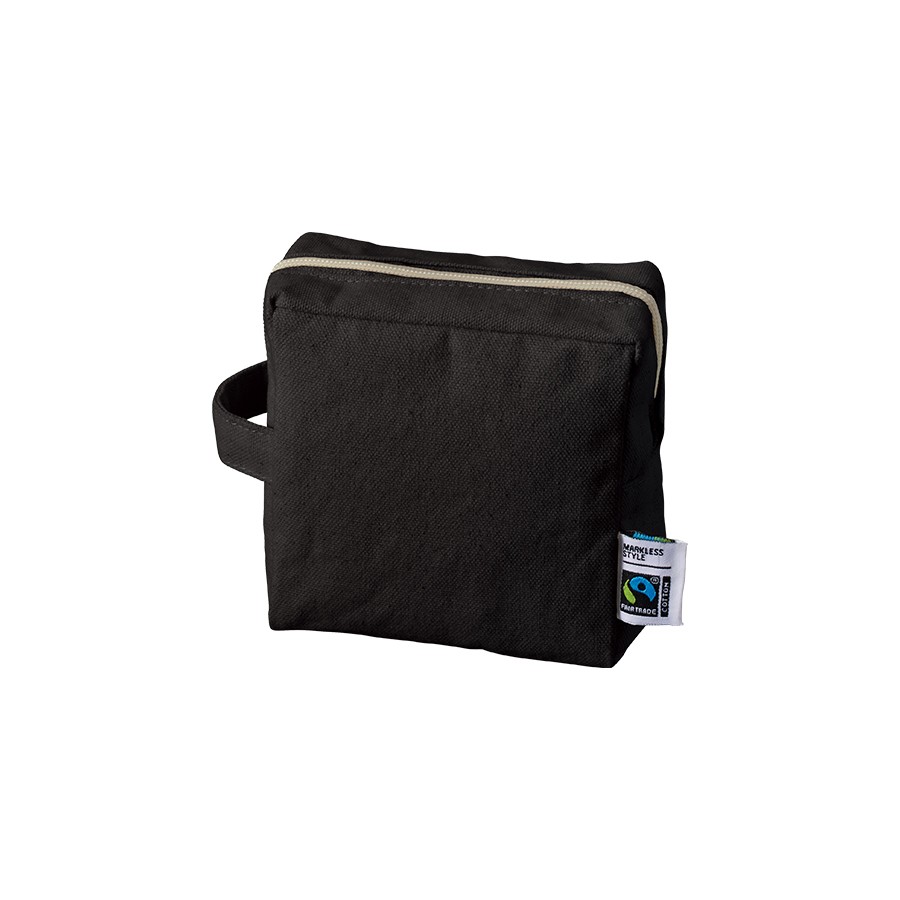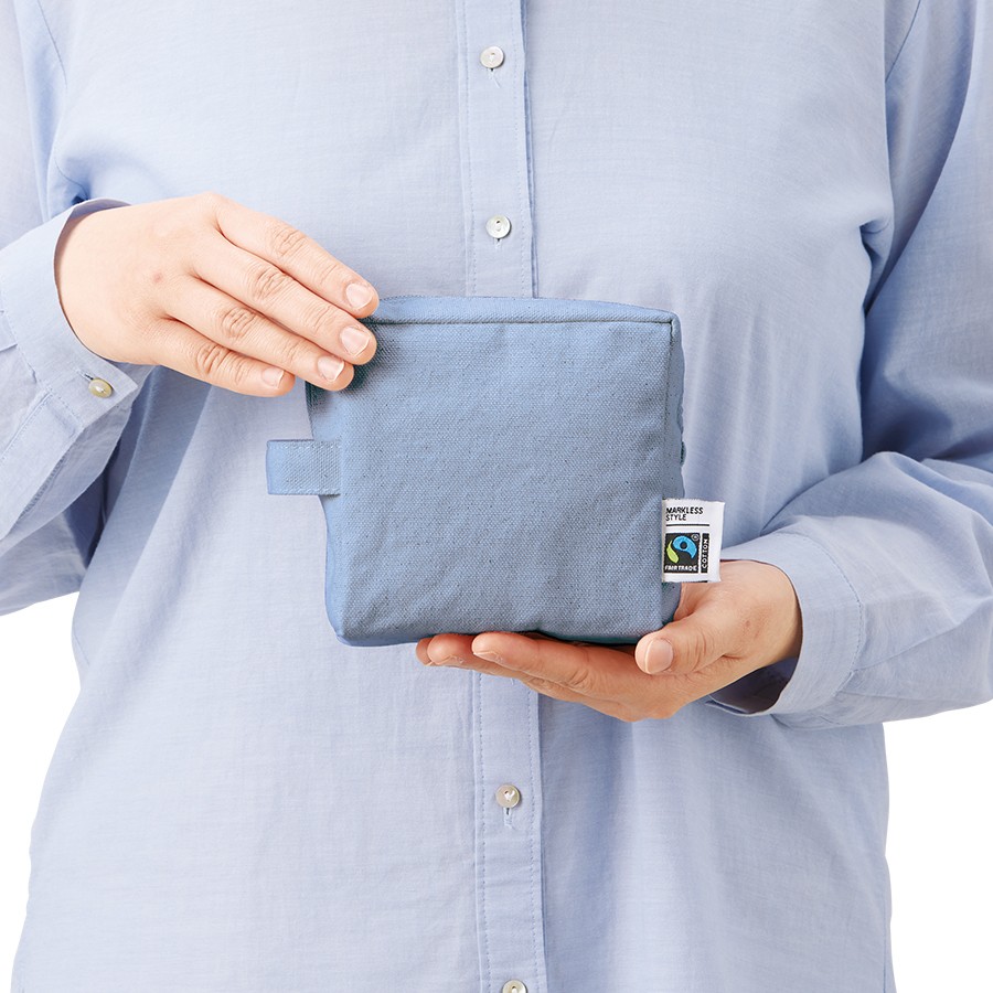 フェアトレードコットンを使用したキャンバスポーチです。スクエアタイプのポーチで、アクセントとしてハンドルが付いているのが特徴です。Sサイズは正方形型で、リップやイヤホン等の小物を入れることができ、普段使いにもオススメのサイズ感です。サイズはS・M・Lサイズの3サイズ展開しており、ご利用用途によって使い分けがしやすい商品です。国際フェアトレード認証ラベル付きのアイテムとなっており、SDGsやサスティナブルへの取り組みで企業価値を高められます。染色工場もフェアトレード認定工場で生産されており、染料は第三者認証を受けた製造工場で生産しているものを使用しております。