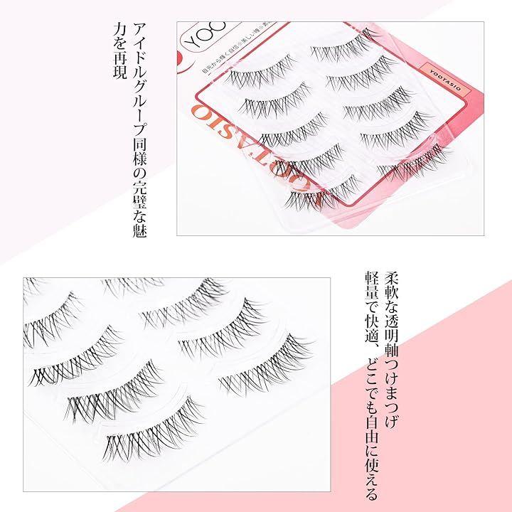 「柔軟な透明軸つけまつげ束感」YOOTASIOこのつけまつげは、アイドルグループのステージメイクからインスパイアされ、繊細な繊維とボリューム感で自然な束感を実現します。