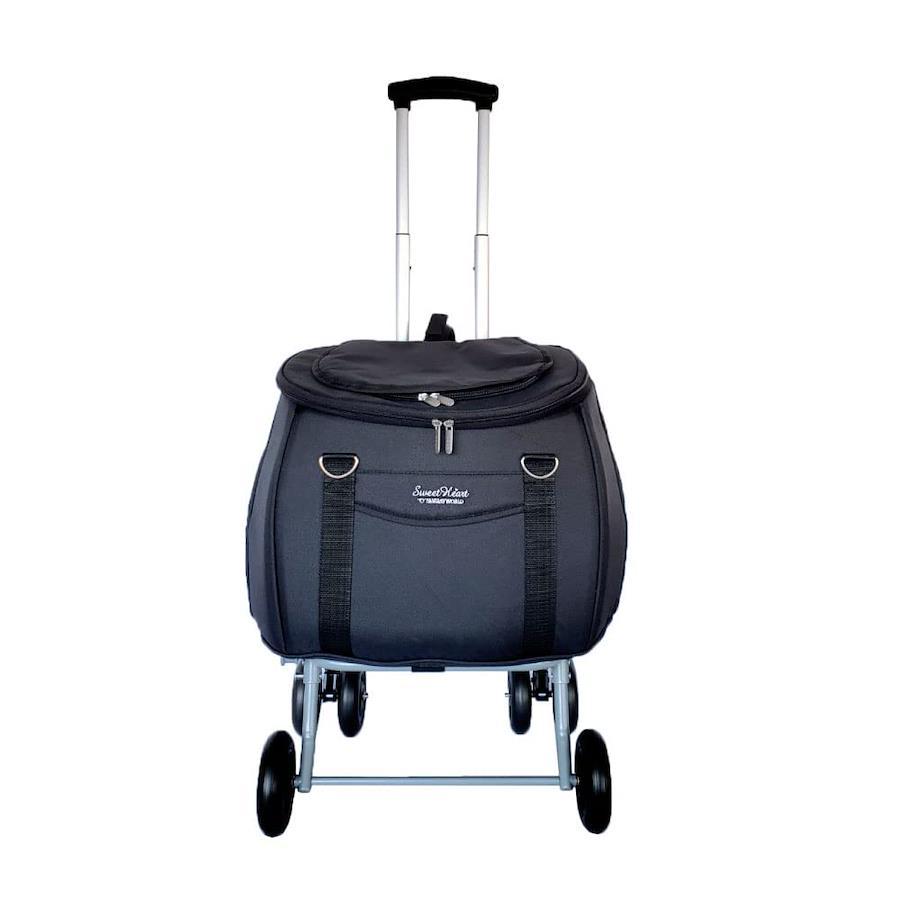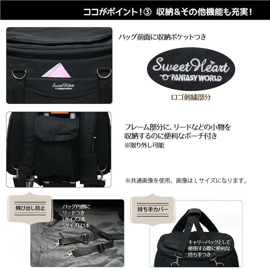 「スイートハート Sサイズ」コンパクトだけど多機能なペットカート 大好評のスイートハートカートが新たにリュックとしてもご使用することができる新機能を搭載しました。 【スイートハート 4WAY】 1.カートとして使用 2.キャリーバッグとして使用 3.車のシートベルトを付けてドライブキャリーとして使用 4.リュックとして使用 ★リュックは背負っている時に肩からベルトがずり落ちないように、 バストの高さに両サイトのベルトを固定するパーツがついています。 ★カートとしての使用時、ハンドルを傾斜しても、バッグは垂直のまま。ペットへのストレスを軽減できます。 ★ペットの突然の飛び出しを防止する【飛び出し防止金具】が付いていますのでとっても安全です。 ≪フレーム≫ ・スリム&軽量 ・バッグは取り外し可能 ・360°回転する後輪でスムーズな運転 ・地面からの熱をやわらげ静音性も◎ ・収納時には場所をとらず車載にも便利 ・ハンドルを傾斜させても斜めにならない! 3WAY機能 ・収納バッグ付き ≪バッグ≫ ・日よけ&飛出し防止テント ・メッシュ窓のカバー開閉可能 ・通気性に優れ、ペットの様子を観察できます ・前面に小物用ポケット付き ・カートとの接続もかんたん! ・飛出し防止のリードフック1本付 ■サイズ:約46×32×99cm、(折りたたみ時)約41×19×61.5cm、(バッグ)約46×28×32cm ■適応体重:約~8kg ■材質:(カート)スチール、プラスチック、(バッグ)材質:スチール、ポリエステル、ナイロン