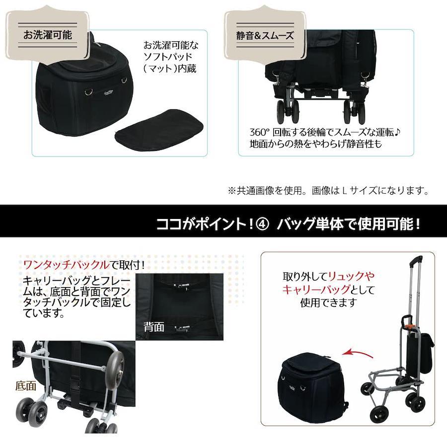1.カートとして使用 2.キャリーバッグとして使用 3.車のシートベルトを付けてドライブキャリーとして使用 4.リュックとして使用