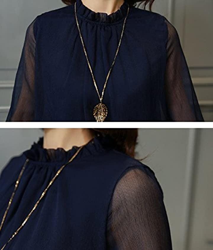 大人ハイネックラインがきれいなデコルテに見せてくれ、しっかりギャザーの入ったふんわりパフスリーブが二の腕カバーもしてくれます。