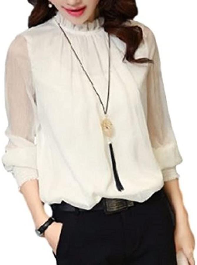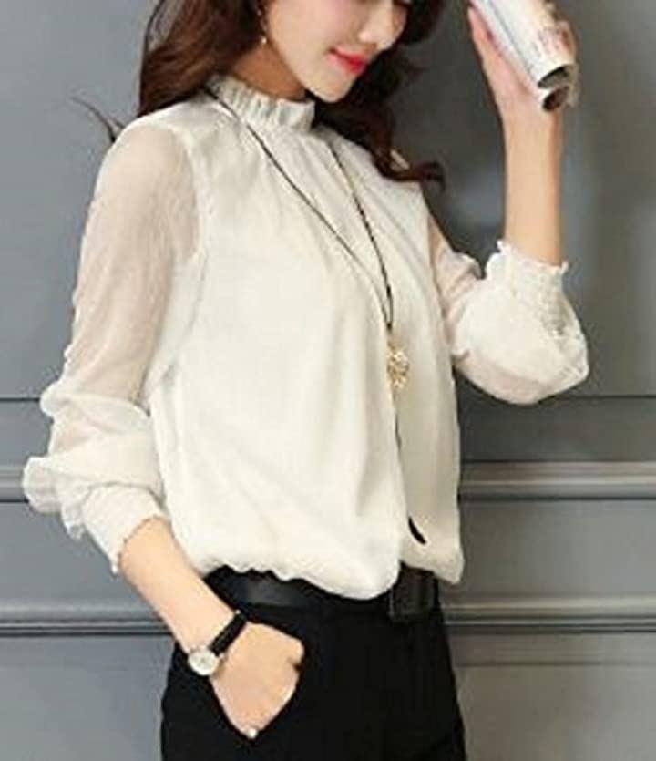 大人ハイネックラインがきれいなデコルテに見せてくれ、しっかりギャザーの入ったふんわりパフスリーブが二の腕カバーもしてくれます。