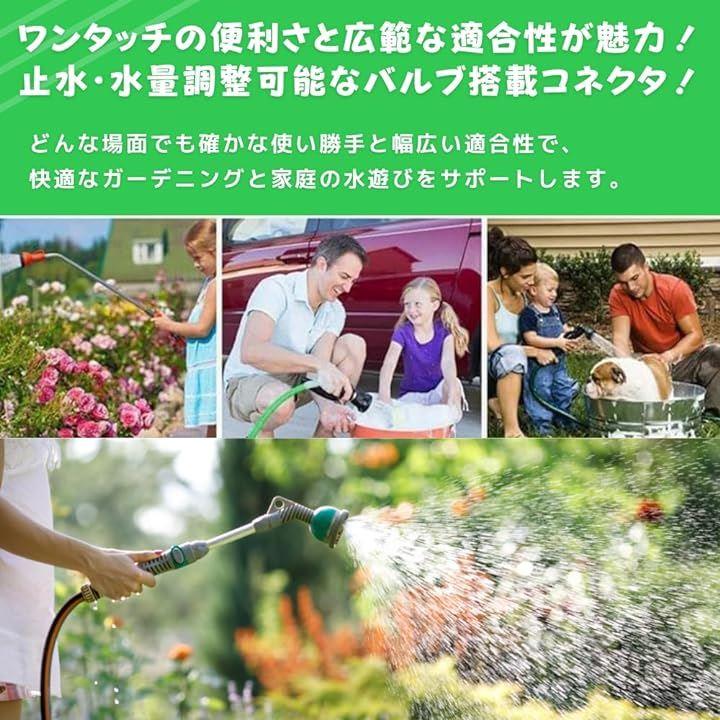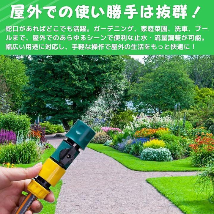 止水・水量調整可能なバルブ搭載コネクタで、ガーデニングや洗車ももっと楽しく。」 「スムーズな操作体験」このワンタッチ蛇口コネクターは、ワンタッチの接続ジョイントおよび左右90度回転の止水栓コックを搭載し、簡単かつスムーズな操作が可能です。