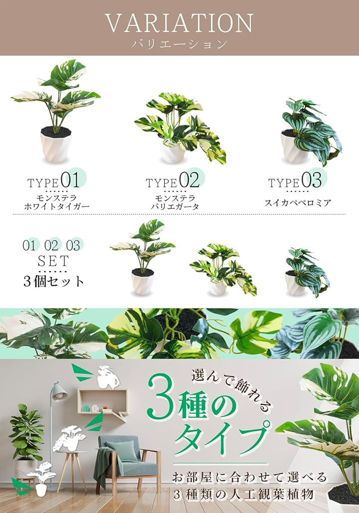 リアルな質感のフェイクグリーン3種は、コンパクトなサイズ感ながらインパクトのあるデザイン。