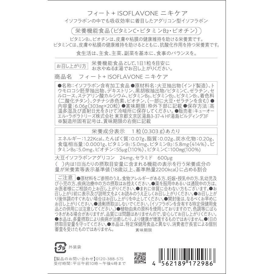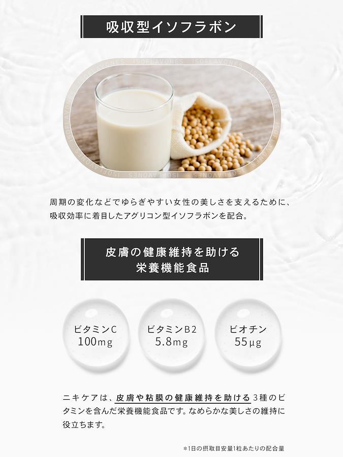 ■サイズ:??16.9x9.8x1.1cm;10gイソフラボン・ビタミンC・ビタミンB1・ビタミンB2・ビオチン・セラミド含有、ニキケア。 【栄養機能食品(ビタミンC・ビタミンB2・ビオチン)】ビタミンB2、ビオチンは、皮膚や粘膜の健康維持を助ける栄養素です。ビタミンCは、皮膚や粘膜の健康維持を助けるとともに、抗酸化作用を持つ栄養素です。 ●本品は、多量摂取により疾病が治癒したり、より健康が増進するものではありません。●1日の摂取目安量を守ってください。●本品は、特定保健用食品と異なり、消費者庁長官による個別審査を受けたものではありません。●食生活は、主食、主菜、副菜を基本に、食事のバランスを。 ※パッケージデザイン等は予告なく変更されることがあります イソフラボン・ビタミンC・ビタミンB1・ビタミンB2・ビオチン・セラミド含有、ニキケア。 【栄養機能食品(ビタミンC・ビタミンB2・ビオチン)】ビタミンB2、ビオチンは、皮膚や粘膜の健康維持を助ける栄養素です。ビタミンCは、皮膚や粘膜の健康維持を助けるとともに、抗酸化作用を持つ栄養素です。 ●本品は、多量摂取により疾病が治癒したり、より健康が増進するものではありません。●1日の摂取目安量を守ってください。●本品は、特定保健用食品と異なり、消費者庁長官による個別審査を受けたものではありません。●食生活は、主食、主菜、副菜を基本に、食事のバランスを。 ※パッケージデザイン等は予告なく変更されることがあります ■重要なお知らせ