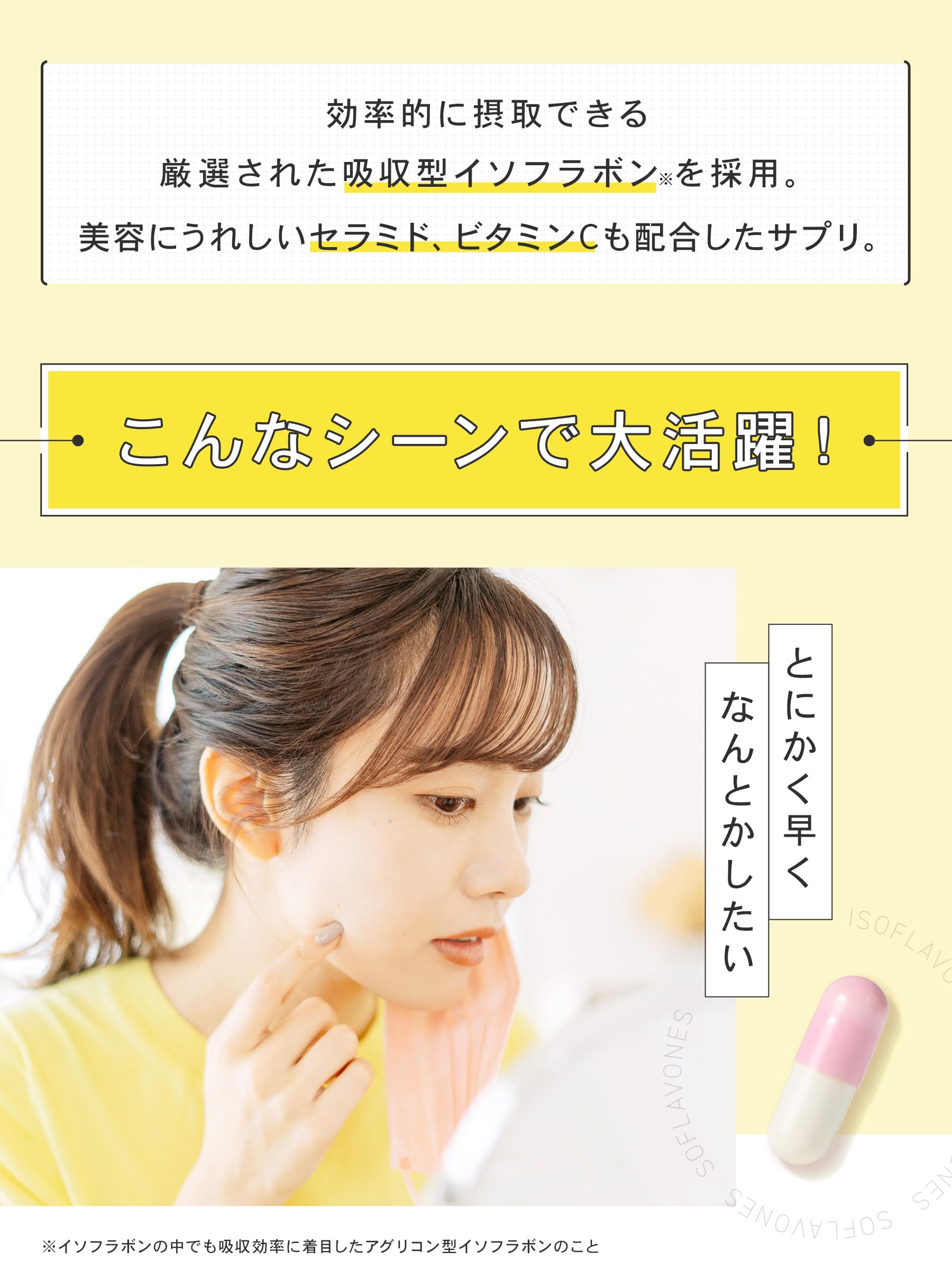 安全上のお知らせご注意:●原材料をご参照のうえ、食物アレルギーがある方、妊娠・授乳中の方、疾病治療中の方の摂取はお控えください。●まれに体質に合わない方もございます。●お召し上がり前に表示及び説明文をよくお読みのうえ正しくお召し上がりください。●お召し上がり後体調のすぐれない場合はお召し上がりを中止してください。●開封後は、なるべくお早めにお召し上がりください。●植物由来の原料を使用しておりますので、色調等にばらつきがある場合がありますが、品質には問題はありませんので、安心してお召し上がりください。●本品は、多量摂取により疾病が治癒したり、より健康が増進するものではありません。●1日の摂取目安量を守ってください。●本品は、特定保健用食品と異なり、消費者庁長官による個別審査を受けたものではありません。原材料・成分大豆抽出物(インド製造)、トウモロコシ胚芽抽出物、デキストリン、黒胡椒抽出物/ビタミンC、ゼラチン、セルロース、ステアリン酸カルシウム、ビタミンB6、ビタミンB2、ビタミンB1、着色料(二酸化チタン)、クチナシ赤色素、ビオチン、(一部に大豆・ゼラチンを含む) 【栄養成分表示 1粒(0.303g)あたり】エネルギー:1.22Kcal、たんぱく質:0.07g、脂質:0.02g、炭水化物:0.20g、食塩相当量:0.0001g、ビタミンB1:5.0mg、ビタミンB2:5.8mg(414%)、ビタミンB6:5.0mg、ビオチン:55μg(110%)、ビタミンC:100㎎(100%) 大豆イソフラボンアグリコン 24mg、セラミド 600μ ( )内は1日当たりの摂取目安量に含まれる機能の表示を行う栄養成分の量が栄養素等表示基準値(18歳以上、基準熱量2200kcal)に占める割合使用方法栄養機能食品として、1日1粒を目安にお水やぬるま湯でお召し上がりください。