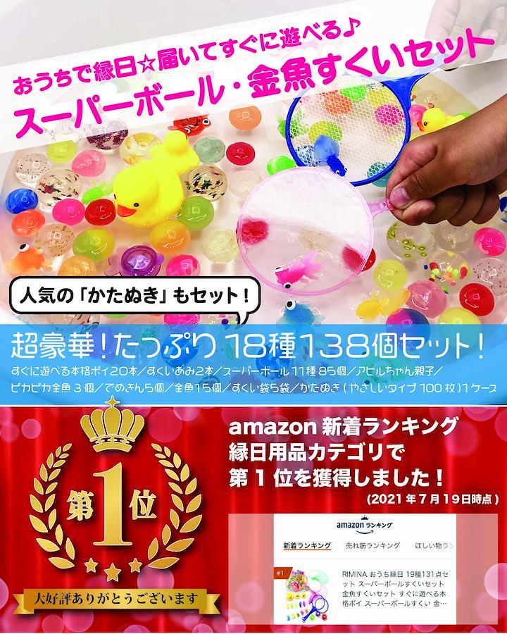 【充実のおうち縁日セット】 ご自宅でスーパーボールすくいや金魚すくいを楽しみたい方の為の超豪華セットです! ご家族でもご友人とでも、きんぎょすくいセット・スーパーボールすくいセット、どちらもお楽しみ頂けます。実際にお祭り・縁日でも使用されている職人が作る日本製ポイと紙が無くなっても何度でも使える網タイプのポイで夏祭り気分でおうち縁日をお楽しみいただけます。 【安心の日本製ポイ】 ポイはすくい遊びをする時に一番重要なアイテム!RIMINAすくい遊びのポイは安心・高品質な実際にお祭り・縁日でも使用されている職人が作る日本製ポイを使用しています。日本製ポイは日本の老舗玩具メーカーが製造している本格的な作りで、すくい紙はスーパーボール等をすくうのに適した、より強度のある5号タイプを使用しています。また、小さなお子様でもすくい遊びを楽しんで頂けるように、交換不要の網タイプのポイも2本ご用意していますので、紙が無くなっても、ず?っと縁日遊びをお楽しみ頂けます! 【様々な種類のおもちゃ】 おもちゃは充実の15種類!様々なスーパーボールに沢山のきんぎょ、光ってお祭り気分を盛り上げるピカピカすくい等、可愛くて色々な種類のアイテムを揃えました。おもちゃ毎にすくい遊びの難しさも変わりますので、子供はもちろん、大人だけでも十分にお楽しみ頂けます。特にスーパーボールの取り合わせを他社で購入した際、小さいものがほとんどでガッカリしたという声が多い為、難易度最大の32mmスーパーボールやカラフル・柄付きのボール・蛍光ボール等、厳選した色とりどりの種類・サイズを集めています。 【安心の日本販売店】 RIMINAは商標登録を行っている日本ブランドで、日本の販売店が責任を持って販売しております。海外の販売店と違い日本人担当者による検品体制を取っており、また万が一の不良等があった場合にも、 しっかりと保証やアフターサポートをさせて頂きますので、安心してご購入下さい。 【ご使用にあたってのご注意】 * こちらの商品は安全の為、6歳以上適用商品です。 * 窒息の危険がある為、スーパーボールや金魚等のおもちゃを絶対に口の中に入れないてください。 * 小さいお子様の場合、必ず保護者の方が一緒に遊んでください。 * お風呂で使用したすくい紙を流してしまうと排水溝詰まりの原因となる可能性があります。