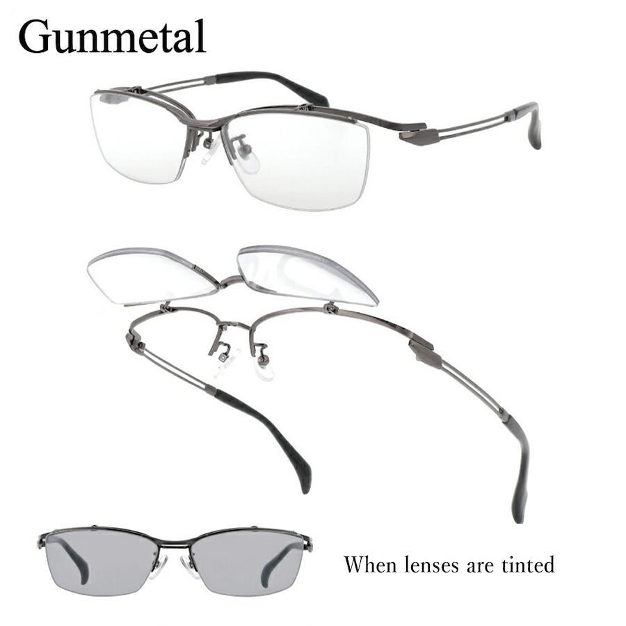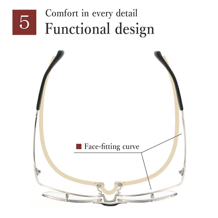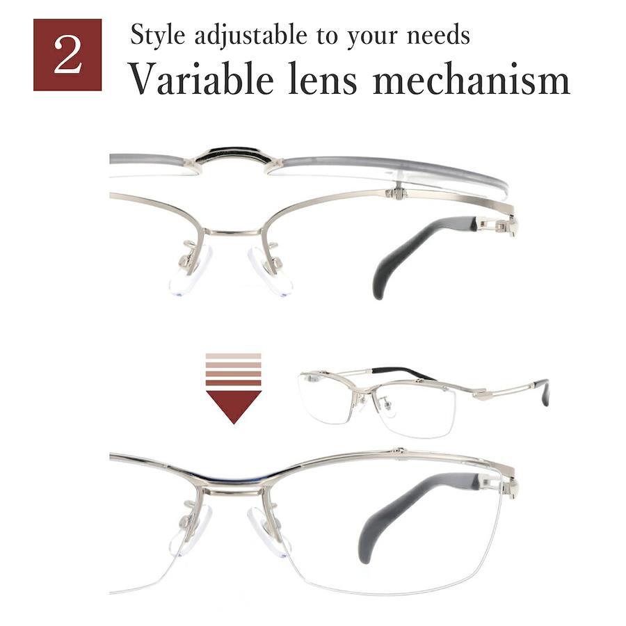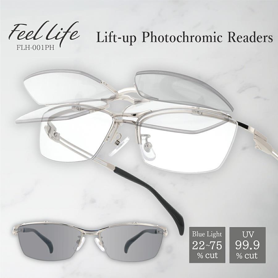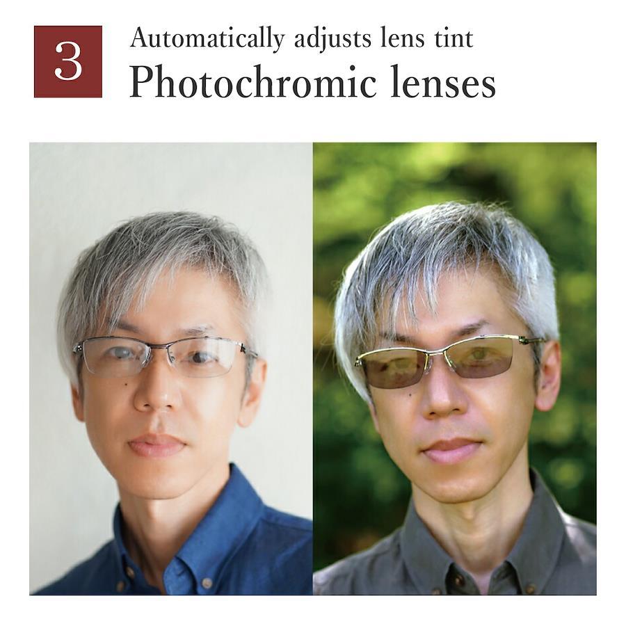 見る事に(魅せる事)をプラスしたシャープでスタイリッシュなデザイン。跳ね上げ式の老眼鏡で、かけ外す事なく手元や遠くを見る事ができると共に、調光レンズ機能によって、屋外ではレンズ色が濃くなり紫外線や眩しさを防ぎます。