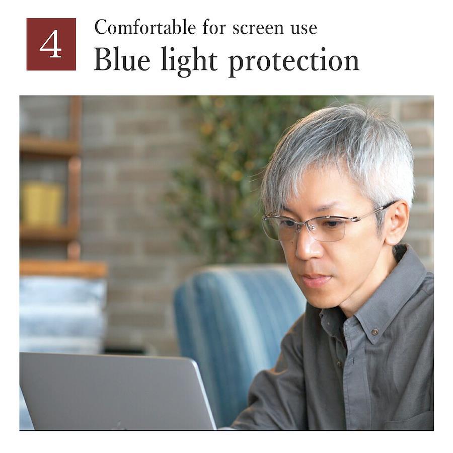 老眼レンズはUV99.9%カットとブルーライト22~75%カットで、屋内外様々なシーンで目の負担を軽減します。