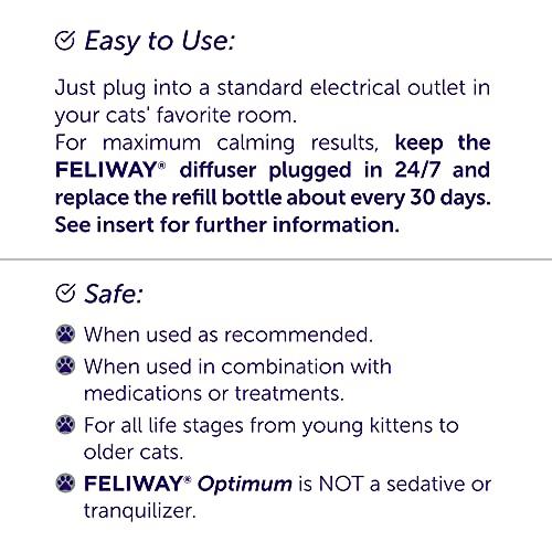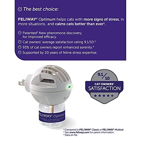 通常1-5営業日で発送:FELIWAY Optimumは特許取得済みのフェロモン発見で、猫のストレスの最も一般的な兆候を減らすのに役立つ最高のFELIWAY回答です。 より多くのストレスの兆候を助け、より多くの状況で猫を落ち着かせます。引っかき傷、尿噴霧(おしっこ)、猫間の緊張、葛藤、一般的な恐怖、変化に対する反応を軽減します。 FFELIWAYの25年以上のネコのストレスの専門知識に裏打ちされたこの新しい発見は、高度な落ち着きメッセージを提供し、猫がこれまで以上に快適に過ごせるのに役立ちます。 調査結果、猫の飼い主の93%が、FELIWAY Optimumを使用しているときに猫の落ち着きを強化したと報告しました。 FELIWAY Optimumの加熱ディフューザーと詰め替え用は、150平方フィートの範囲で最大30日間、落ち着きのあるフェロモンを継続して提供します。 部屋が150平方フィートを超える場合は、追加のディフューザーを使用することをお勧めします。 猫が最も時間を費やす部屋や、猫同士の対立が最も頻繁に発生する場所に、FELIWAY Optimum ディフューザーを差し込むことをお勧めします。 ディフュ