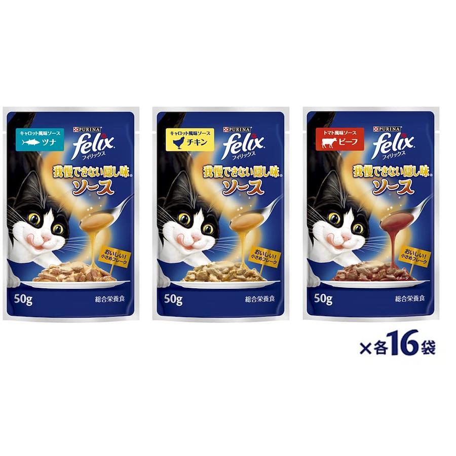やわらかくほぐしたお魚やお肉のうまみに隠し味として食欲そそるソースをからめたごはん。 人気のツナ・チキン・ビーフの3種類が入ったバラエティパック。ツナ・チキン・ビーフ 各16袋入り原材料:【キャロット風味ソース ツナ】肉類(チキン、ラム、家禽ミール 等)、小麦たんぱく、魚介類(ツナ 等)、鶏脂(オメガ6脂肪酸源)、ぶどう糖、にんじん、アミノ酸類(タウリン)、ミネラル類(Ca、P、K、Na、Cl、Mg、Fe、Cu、Mn、Zn、I)、増粘多糖類、ビタミン類(A、D、E、K、B1、B2、パントテン酸、ナイアシン、B6、葉酸、ビオチン、B12、コリン)、着色料(酸化鉄) 【キャロット風味ソース チキン】肉類(チキン、ラム、家禽ミール 等)、小麦たんぱく、鶏脂(オメガ6脂肪酸源)、ぶどう糖、にんじん、アミノ酸類(タウリン)、ミネラル類(Ca、P、K、Na、Cl、Mg、Fe、Cu、Mn、Zn、I)、増粘多糖類、ビタミン類(A、D、E、K、B1、B2、パントテン酸、ナイアシン、B6、葉酸、ビオチン、B12、コリン)、着色料(酸化鉄)原材料:【トマト風味ソース ビーフ】肉類(チキン、ビーフ、家禽ミール 等)、小麦たんぱく、鶏脂(オメガ6脂肪酸源)、ぶどう糖、フィッシュ、トマト、アミノ酸類(タウリン)、ミネラル類(Ca、P、K、Na、Cl、Mg、Fe、Cu、Mn、Zn、I)、増粘多糖類、ビタミン類(A、D、E、K、B1、B2、パントテン酸、ナイアシン、B6、葉酸、ビオチン、B12、コリン)、着色料(カラメル、酸化鉄)保証成分:【キャロット風味ソース ツナ】【キャロット風味ソース チキン】【トマト風味ソース ビーフ】たんぱく質:12%以上、脂質:2.8%以上、粗繊維:0.5%以下、灰分3%以下、水分82%以下