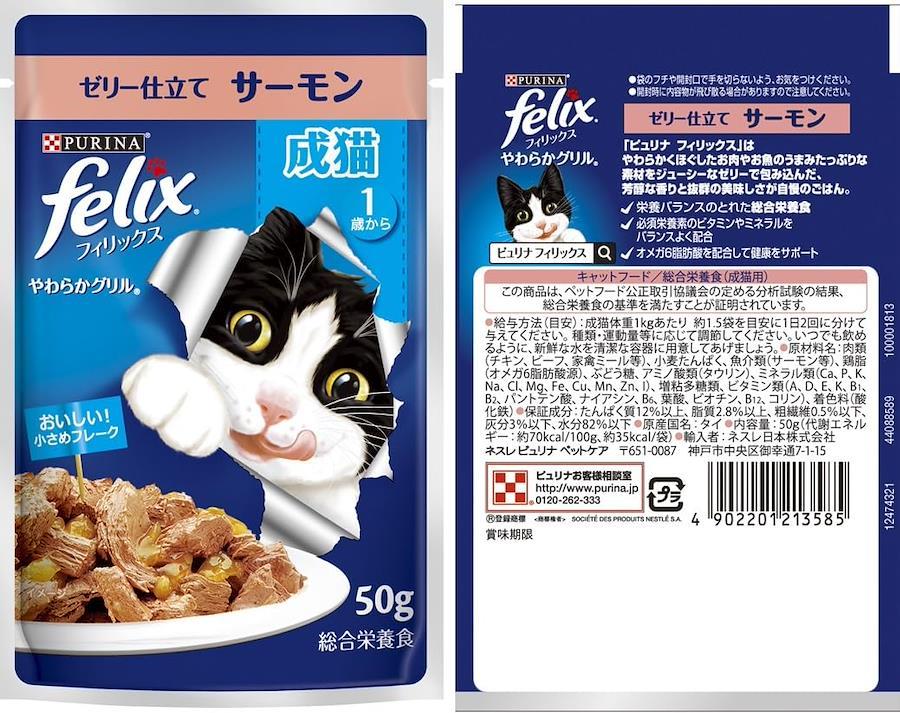 【成猫用 ゼリー仕立て ツナ】肉類(チキン、ビーフ、家禽ミール 等)、小麦たんぱく、魚介類(ツナ 等)、鶏脂(オメガ6脂肪酸源)、ぶどう糖、アミノ酸類(タウリン)、ミネラル類(Ca、P、K、Na、Cl、Mg、Fe、Cu、Mn、Zn、I)、増粘多糖類、ビタミン類(A、D、E、K、B1、B2、パントテン酸、ナイアシン、B6、葉酸、ビオチン、B12、コリン)、着色料(酸化鉄) 【成猫用 ゼリー仕立て サーモン】肉類(チキン、ビーフ、家禽ミール 等)、小麦たんぱく、魚介類(サーモン 等)、鶏脂(オメガ6脂肪酸源)、ぶどう糖、アミノ酸類(タウリン)、ミネラル類(Ca、P、K、Na、Cl、Mg、Fe、Cu、Mn、Zn、I)、増粘多糖類、ビタミン類(A、D、E、K、B1、B2、パントテン酸、ナイアシン、B6、葉酸、ビオチン、B12、コリン)、着色料(酸化鉄)