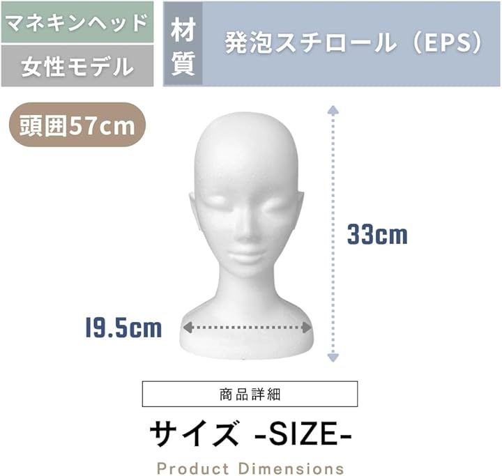 「商品内容」サイズ(約):頭囲57cm、全高33cm、幅19.5cm 主な材質:発泡スチロール *サイズ詳細は商品画像をご確認ください。