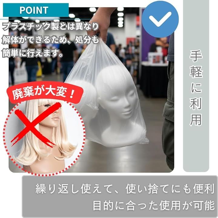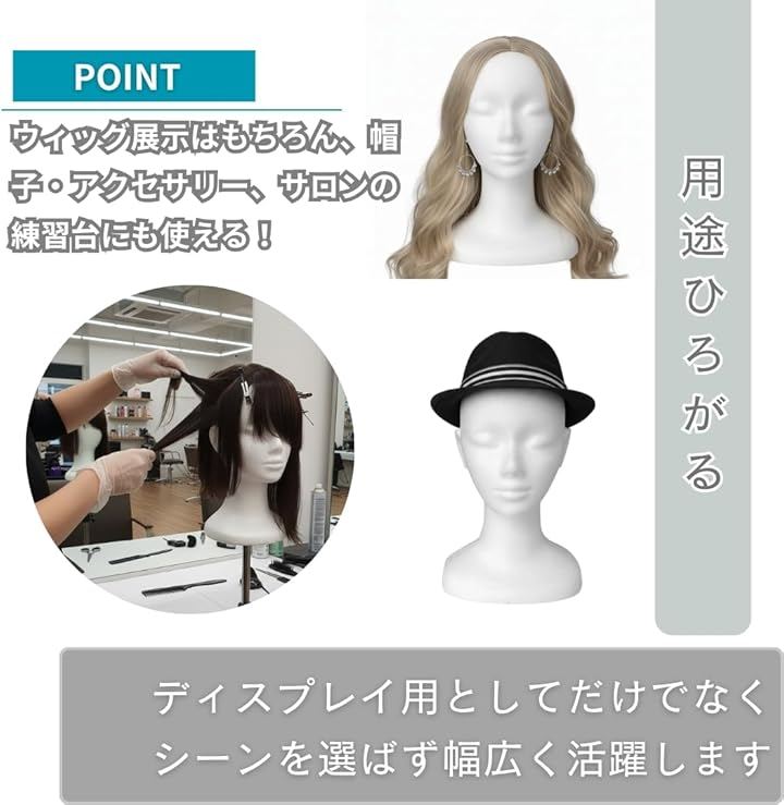 「用途ひろがる」ウィッグ展示はもちろん、帽子・ヘッドホン・アクセサリーなどディスプレイ用途は様々。
