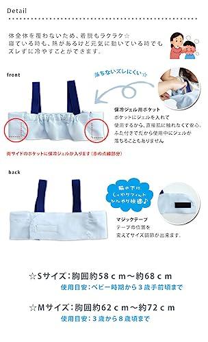 原産国 日本 直接冷やしにくい脇の下を、効果的に冷やすとこが出来ます。子供用Sサイズ:胸囲約58cm~約68cm 使用目安:ベビー時期から3歳手前頃まで子供用Mサイズ:胸囲約62cm~約72cm 使用目安:3歳から8歳頃まで大人用Mサイズ:約75cm~約100cm大人用Lサイズ:約100cm~約125cm固くならない保冷剤 2個付き
