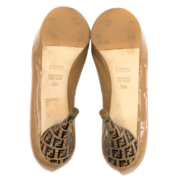 ■採寸#36 1/2 日本サイズ:約23c 甲幅:約8cm ヒール高さ:9.5cm■素材表記なし■コメントフェンディからパンプスが入荷しました!やや濃いめのベージュカラーのシンプルなエナメルパンプスで、木目調の様なヒール全体にFF柄がデザインされた一品です☆全体にエナメル特有のべたつき、インソールにスレや汚れ、ヒールにキズやFF柄の剥げが見受けられる為Bランクでのご紹介となりました。着用時に目立つダメージや汚れはございませんので、普段使いとしては問題ございません◎※中古品の為、ヒールのゴムに劣化が出ている場合がございます。新しいゴムに替えて頂いてからのご試着をお勧め致します。