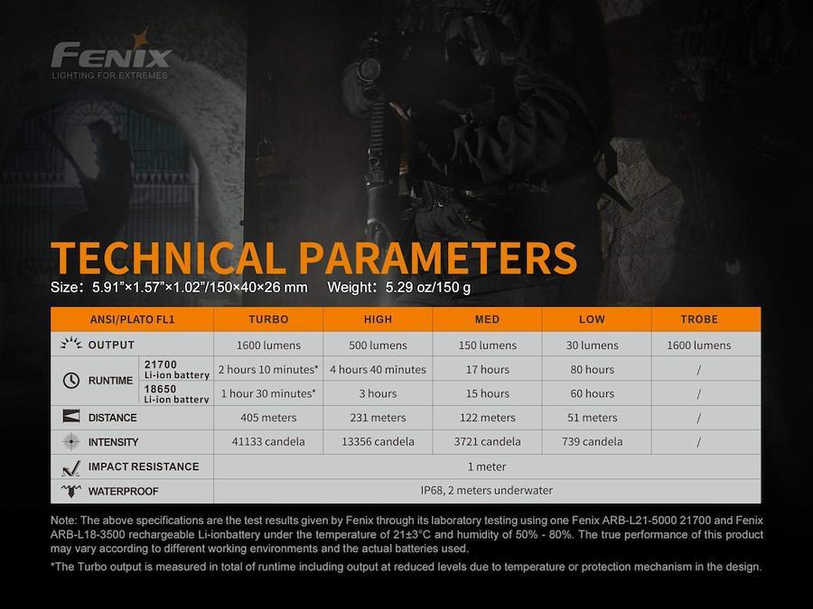 サイズ: 150mm /40mm /26mm使用電池:保護回路付21700リチウムイオン充電池 1個(付属) 或は、保護回路付18650リチウム充電池 1個(別売-専用の変換電池ケースを使用)付属品:充電池(21700 USB直接充電式)、USB充電コード、ボディクリップ、ランヤード、スペアOリング、専用ケース、18650用変換電池ケース、日本語説明書