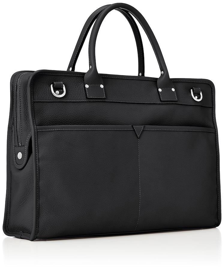 背面にはステッチで仕切られたポケットが2つあり、中央に間仕切りポケットを備えた2室構造で、間口がサイドまで開くダブルジップ式になっており、荷物の出し入れがスマートに行えます。間仕切りにより書類の整理もしやすく、中身も見やすい実用性を備えています。内側にはA4サイズが入るスナップボタン付きポケットが2つ、小ポケットが2つあり、小物の収納も快適です。ショルダーストラップを取り付けることが出来るDカン付き。登録情報