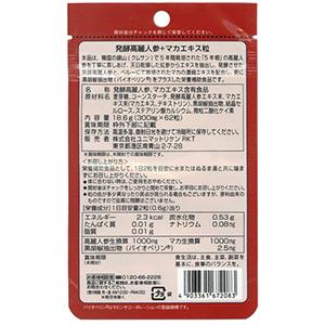 麦芽糖(国内製造)、コーンスターチ、発酵高麗人参エキス末、マカエキス末(マカエキス、デキストリン)、黒胡椒抽出物/結晶セルロース、ステアリン酸カルシウム、微粒二酸化ケイ素