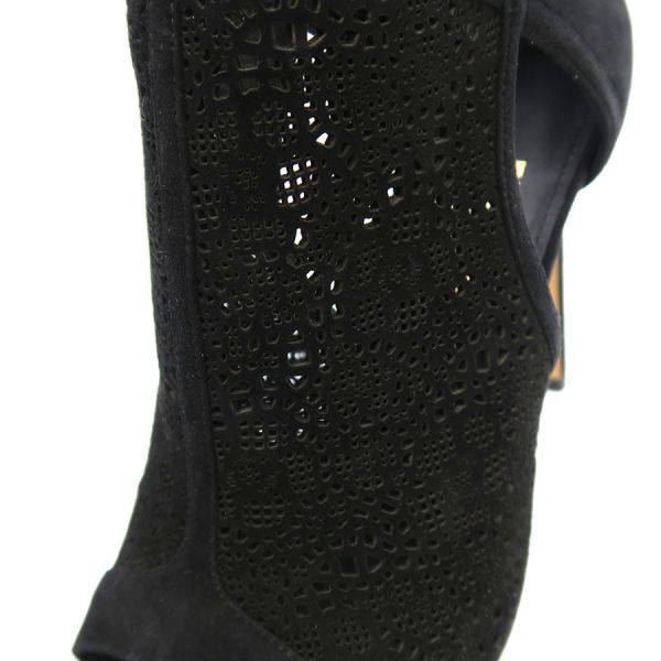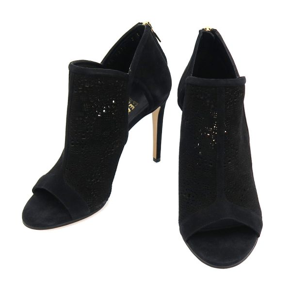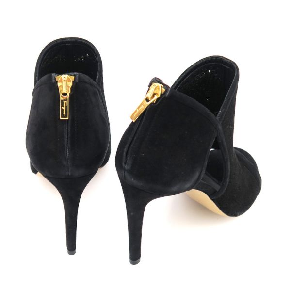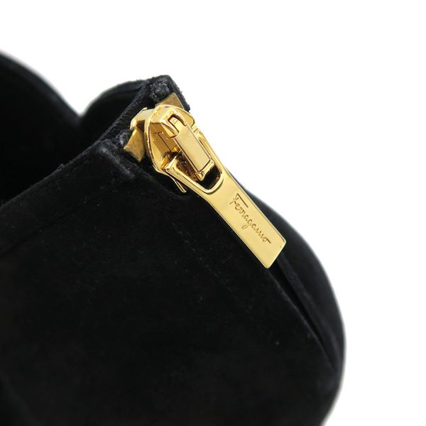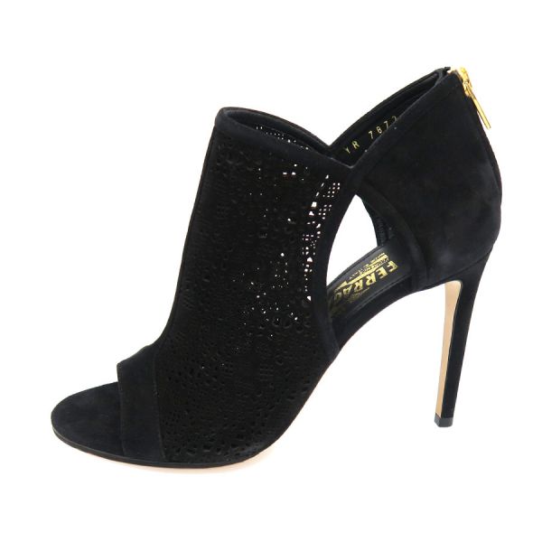 ■採寸#7C 日本サイズ:約24cm 甲幅:約8cm ヒール高さ:10cm■素材表記なし■コメントフェラガモからブーティーが入荷しました!繊細なパンチング加工が施されたスエードレザーがエレガントかつ軽やかな印象を演出してくれる一足☆オープントゥデザインとシックなブラックカラーの洗練された素敵なアイテムです!かかと周りや側面・つま先に白スレ、ジッパーつまみに僅かなスレやくすみが見受けられる為Bランクでのご紹介となりました。白いスレはやや目立ちますが、それ以外は比較的キレイめなお品です。まだまだ問題なくご着用いただけるかと思います◎
