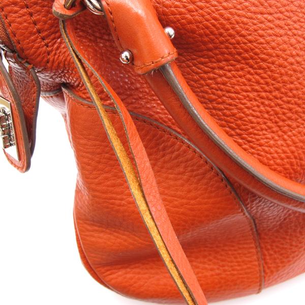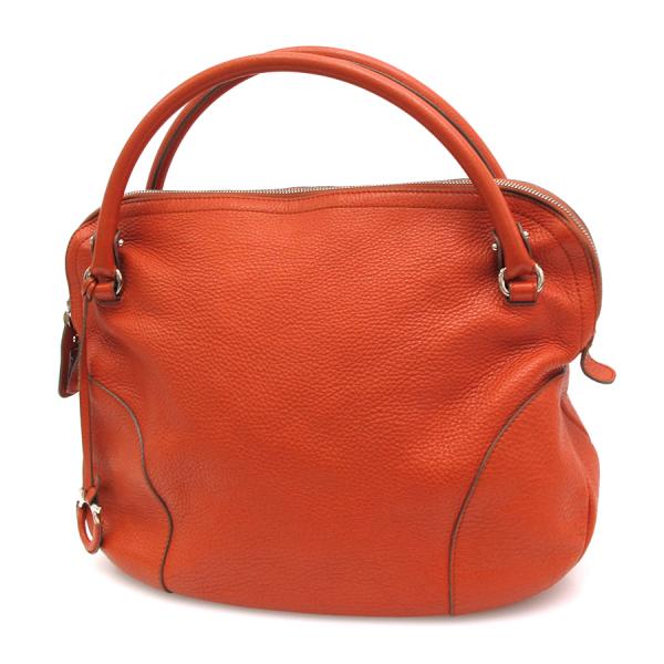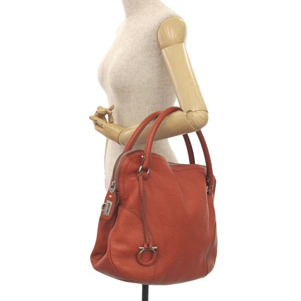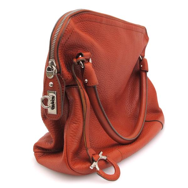 フェラガモからハンドの入荷です!!オレンジ色の型押しレザーにガンチーニモチーフがフェラガモらしい一品☆間口はファスナー開閉式となっており、中はファスナー付ポケット、スリットポケット、マチ付収納スペースがございます。状態はBランクで、型崩れ、角スレ、表面の薄汚れやスレやシワ、四隅のパイピング部分のコーティングのスレやヒビ、ハンドル根元のコーティングスレや裂けや繊維の飛び出し、ハンドルやファスナーつまみのスレやキズやコーティングのヒビ、間口のスレ、側面のレザータブの反りやまくれ、ガンチーニチャームのレザーのスレやハガレやコーティング裂け、金具部分の小傷やくすみ、中の薄汚れやスレ、中の所々に引っ掛けによると思われる糸ツレや糸の飛び出し、収納臭がございます。使用感が感じられますが、その分お買い得価格となっておりますので、気にならない方にオススメです♪