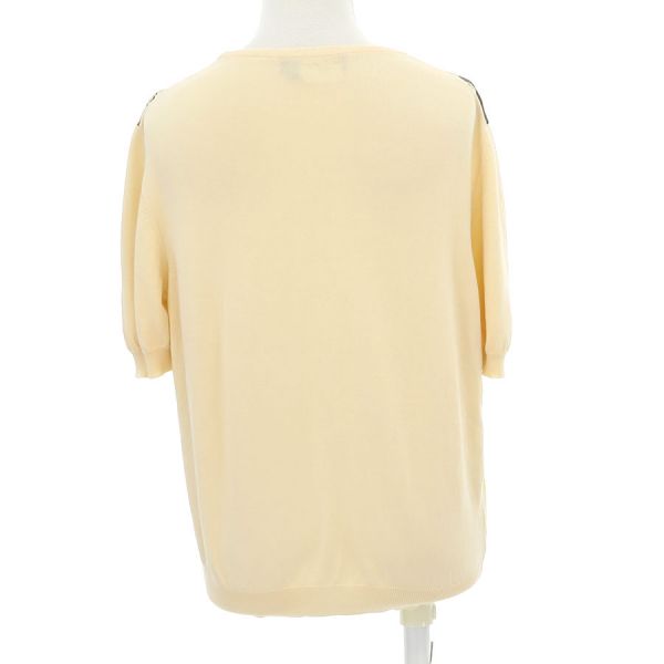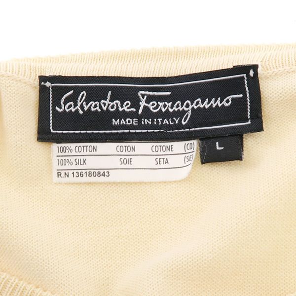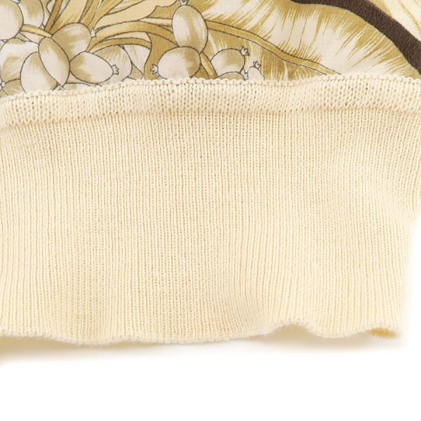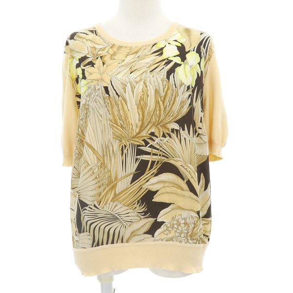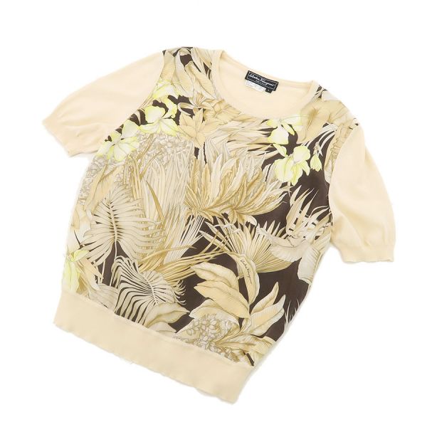 ■採寸#L 肩幅:40cm 袖丈:25cm B:86cm 着丈:53cm■素材コットン100% シルク100%■コメントフェラガモからトップスが入荷しました!ボタニカルデザインのシルク生地と、薄手のコットンニットの異素材が組み合わせられた素敵なトップスです☆全体にシワ、袖や裾のヨレ、襟タグ裏の茶色のシミ汚れと後身頃襟タグ部分に浸透汚れが見受けられる為Bランクでのご紹介となりました。茶色のシミ汚れがやや目立ちますが、髪の長い肩のダウンスタイルや上着を羽織る際には隠れるかと思います◎