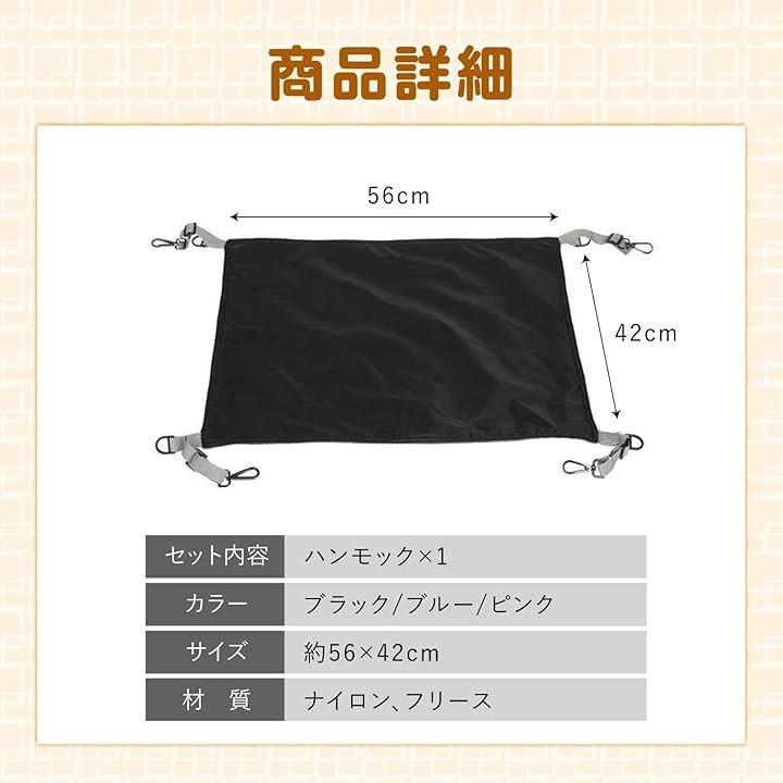 「商品詳細」セット内容:ハンモックx1 カラー:ブラック/ブルー/ピンク サイズ:約56x42cm 材質:ナイロン、フリース *モニターの環境により、色の見え方に若干差が生じる場合がございます。