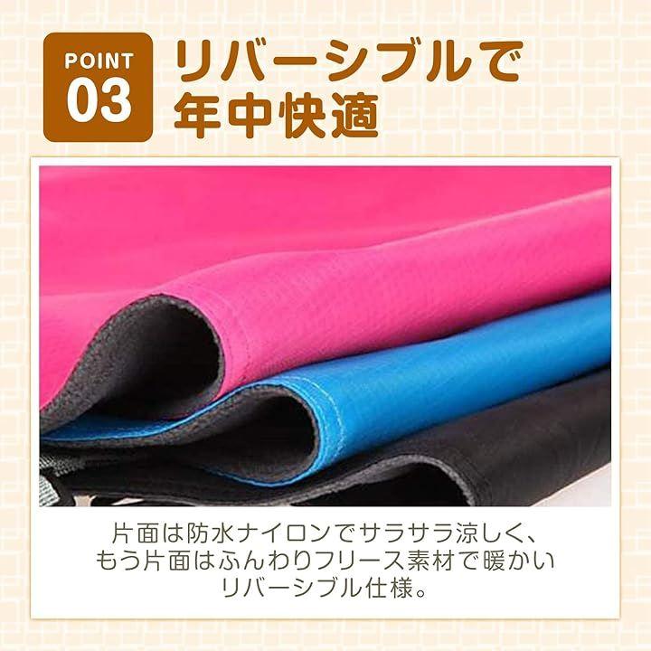 「リバーシブルで快適」片面は防水ナイロンでサラサラ涼しく、もう片面はふんわりフリース素材で暖かいリバーシブル仕様。