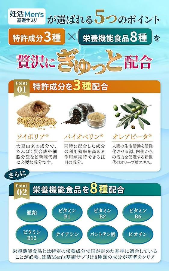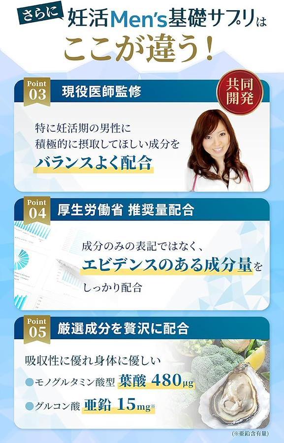 「厚生労働省推奨量」亜鉛、葉酸、ビタミンA、ビタミンB郡、ナイアシン、パントテン酸、ビオチンといった豊富な種類の栄養素を厚生労働省推奨量配合、この公的推奨量を守ることで、妊活中の方々が必要とする栄養素を適切に補給できるように設計されています。