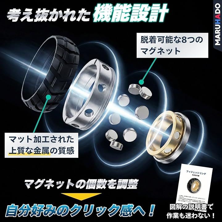 「商品内容」フィジェットリングx1、ハードケースx1、収納袋x1、メンテナンス工具x1、説明書x1 「カラー」ブラック(黒)、フルブラック、シルバー(銀色)、ゴールド(金色) 「材質」アルミ合金 「サイズ」直径約35mm、内径約18mm、厚さ約13mm 「重量」約37g 「注意点」*マグネットの着脱時は紛失にご注意ください。