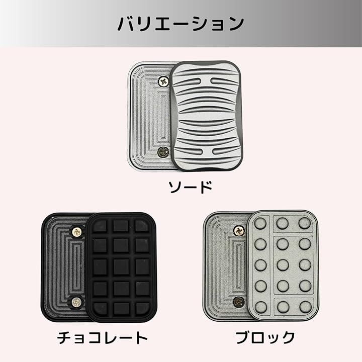 本商品は金属製スライダータイプのフィジェットトイで、2枚の金属プレートの内側には磁石が2列x4個一定の間隔で埋め込まれており、プレートを上下左右にスライドさせたりして遊びます。