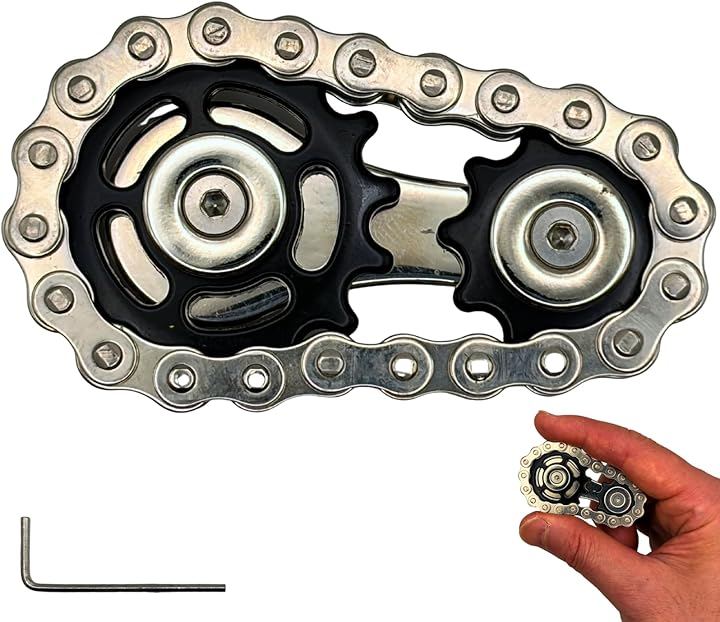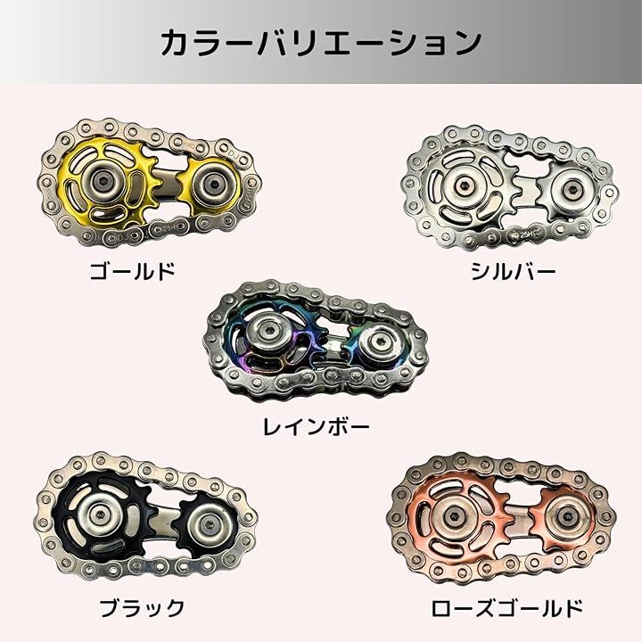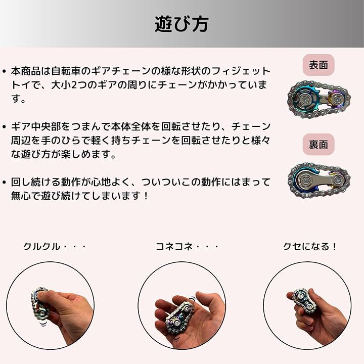 本商品は自転車のギアチェーンの様な形状のフィジェットトイで、大小2つのギアの周りにチェーンがかかっています。
