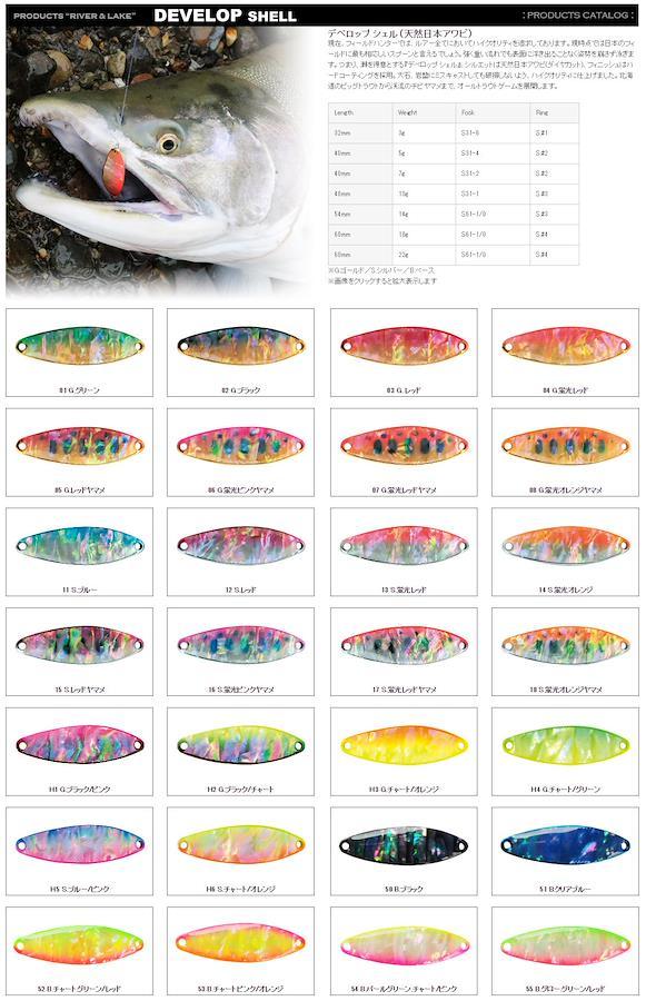 デベロップ シェル(天然日本アワビ) 現在、フィールドハンターでは、ルアー全てにおいてハイクオリティを追求しております。現時点では日本のフィールドに最も相応しいスプーンと言えるでしょう。強く重い流れでも表面に浮き出ることなく姿勢を崩さず泳ぎます。つまり、瀬を得意とする『デベロップ シェル』、シルエットは天然日本アワビ(ダイヤカット)、フィニッシュはハードコーティングを採用。大石、岩盤にミスキャストしても破損しないよう、ハイクオリティに仕上げました。北海道のビッグトラウトから渓流のチビヤマメまで、オールトラウトゲームを展開します。
