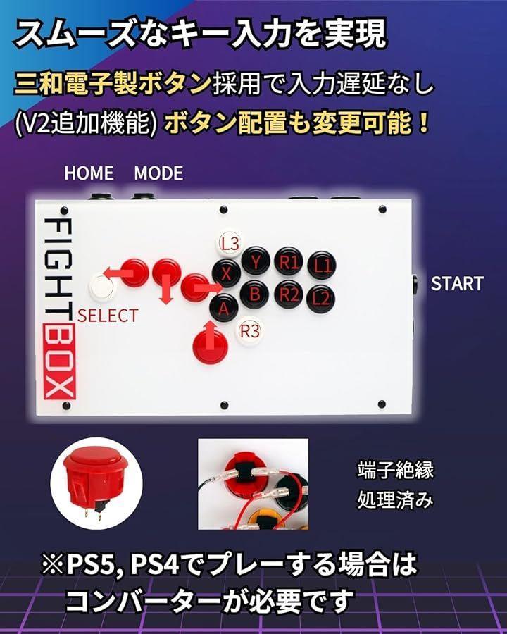 FightBox F10-PC-V2 は、従来のアーケードスティックに配置されているジョイスティックの代わりに、コントローラーの左側に 3 つの三和電子製OBSF-24 ボタンと 1 つの 三和電子製OBSF-30 ボタンがあり、コントローラーの右側のアクション ボタンとして 8 つの 三和電子製OBSF-24 ボタンを配置しています。