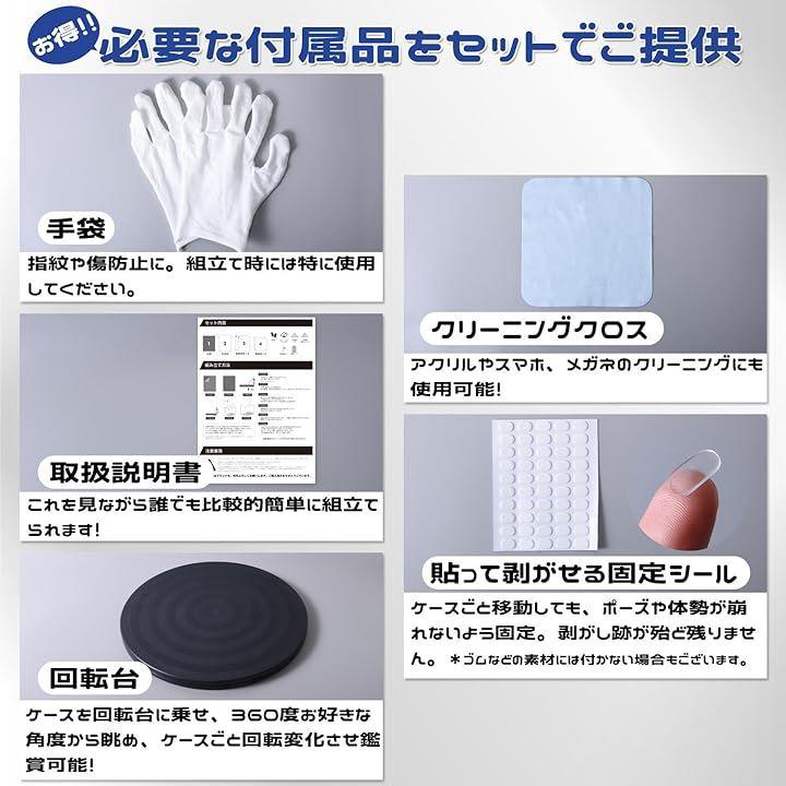 *付属品には、メガネやスマホにも使える、クリーニンググロス、組立て時に使用する左右手袋、説明書、剥がし跡が殆ど残らない 貼って剥がせる固定シール、「360度好きな角度にケースごと回転鑑賞可能」な回転台付きです。