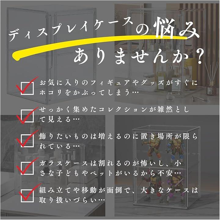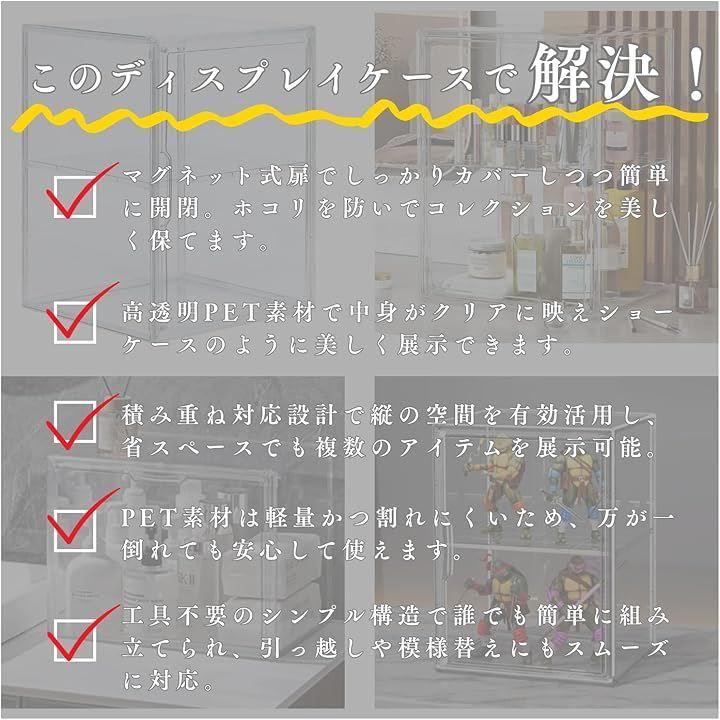 「クリアに魅せるディスプレイケース」 透明度の高いアクリル素材を使用したフィギュアケースは、収納しながらコレクションの美しさを引き立てます。