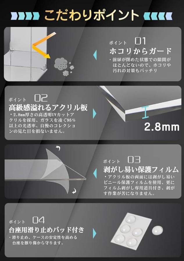 「高強度連結構造」次世代フィギュアケースの登場です。衝撃や揺れでも崩れない三角コネクタ構造により堅牢性を実現。