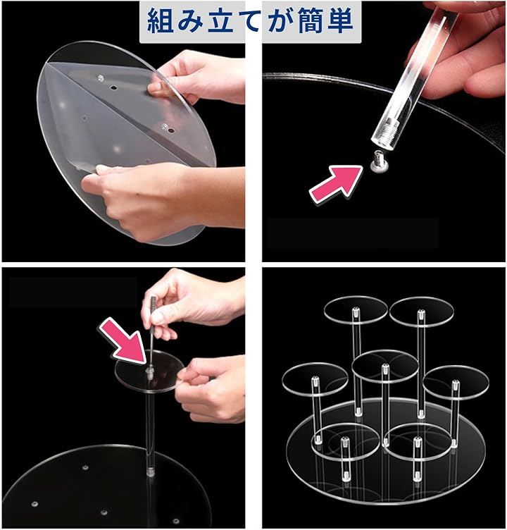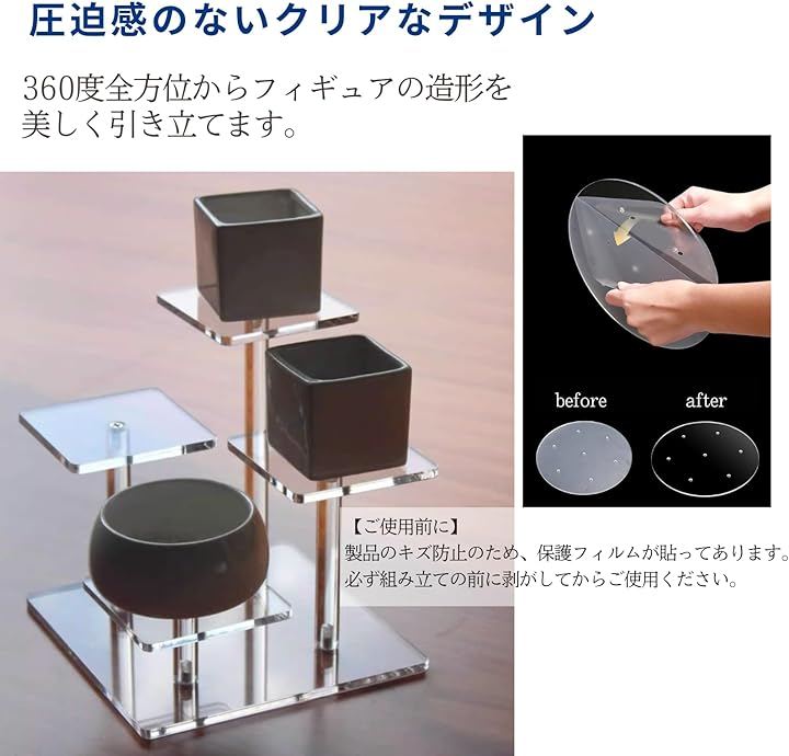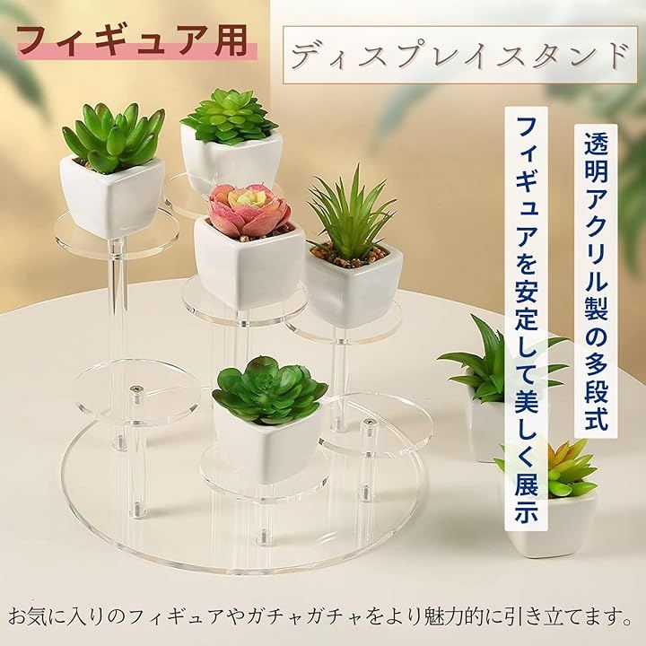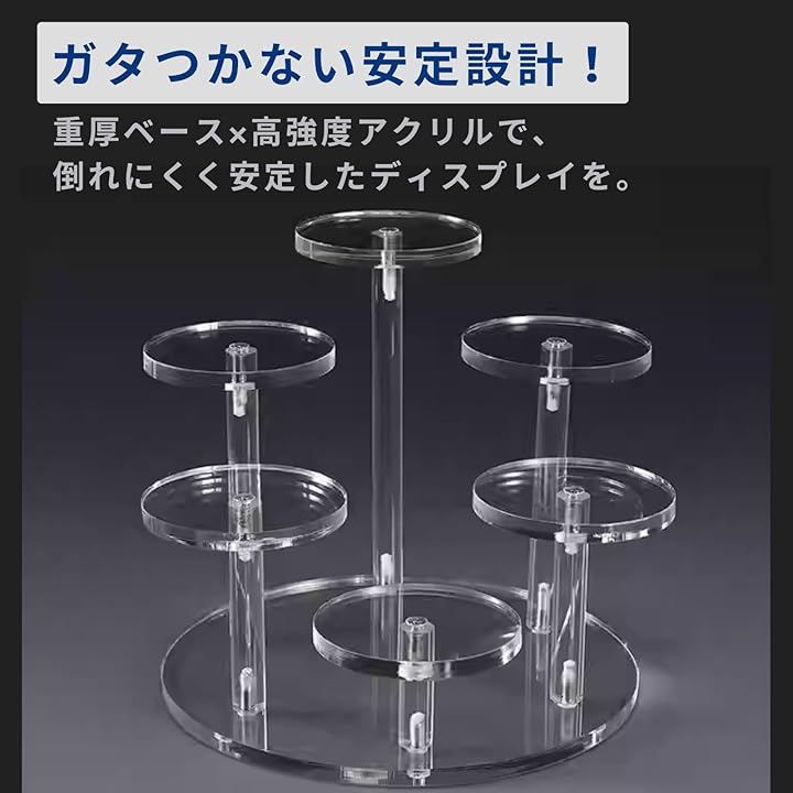 「ディスプレイスタンド」透明アクリル製の多段式スタンドで、フィギュアを安定して美しく展示でき、お気に入りのフィギュアなどをより魅力的に引き立てます。