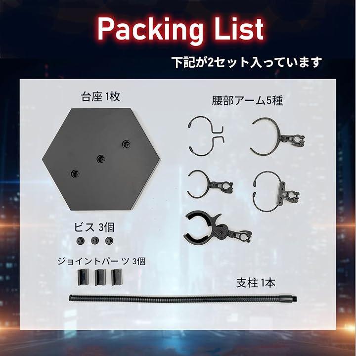 セット内容:台座x2、支柱x2、腰部アーム 5種x2、ジョイントパーツx6、ビスx6