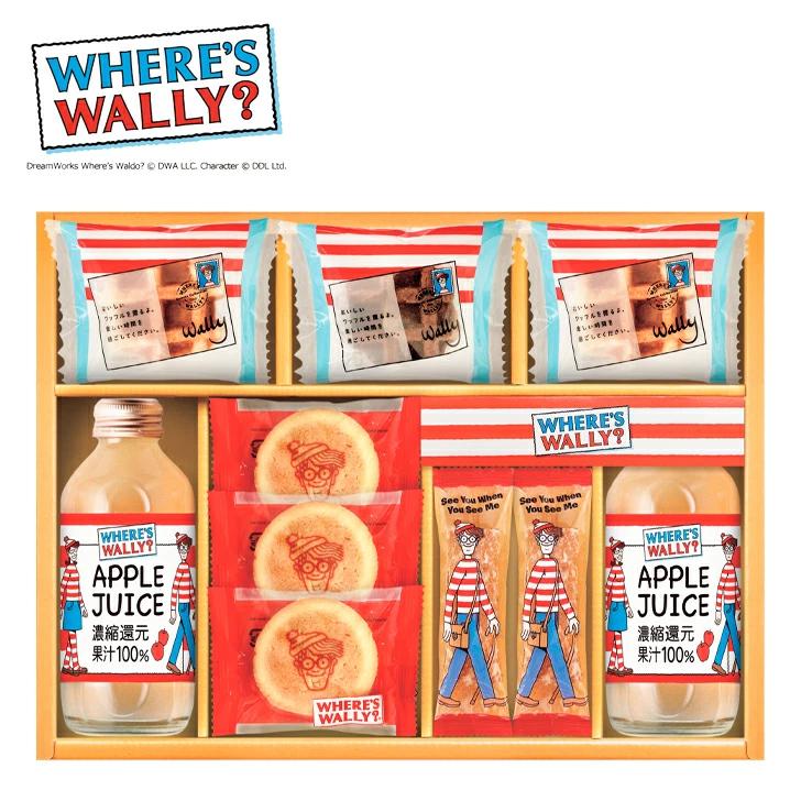 濃縮還元果汁100%ジュースと、ガレットクッキー、ショコラスティックパイ、ワッフルの詰合せ。ガレットクッキーにはウォーリーのイラストがプリントされています。