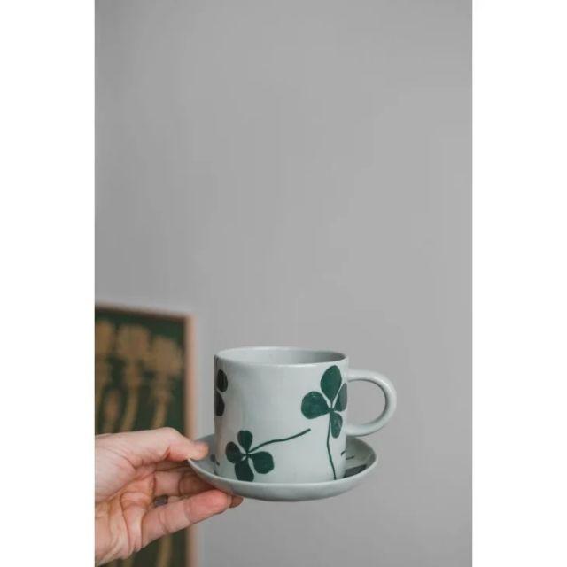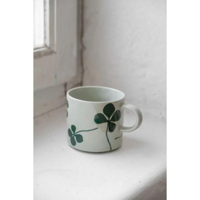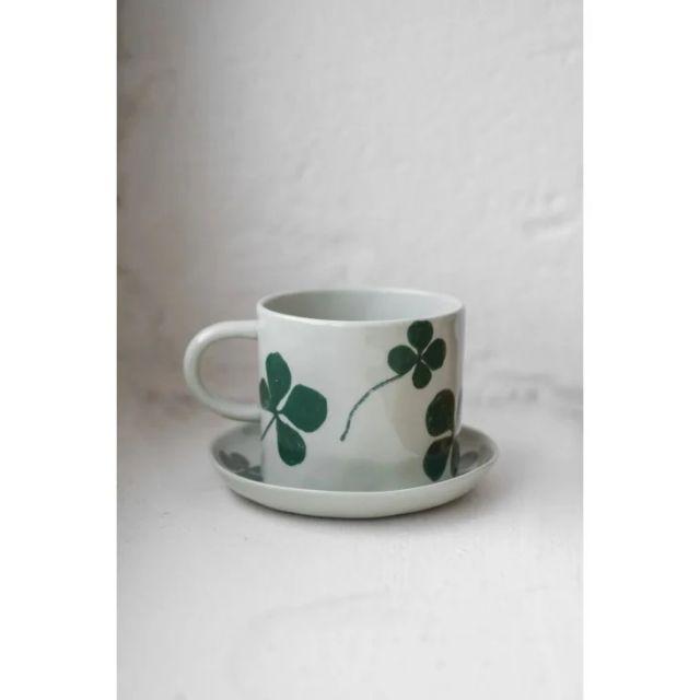 こちらは、陶器作家KajsaCramerとのコラボレーションによるセラミックシリーズに新たにクローバーデザインが加わりました。Kajsaのあえて人の手の痕跡を残したようなセラミックの造形と、Elisabethの不揃いなクローバーデザインが調和し、食卓にユーモアとあたたかみを添えるデザインです。